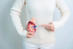 woman holding Anatomical human kidney Adrenal gland model. disease of Urinary system and Stones, Cancer, world kidney day, Chronic kidney and Organ Donor Day concept