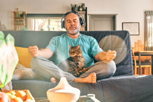 Mature middle-aged overweight man in wireless headphones relaxing at home with his cat and guided meditation, listening to relaxing music on smartphone and meditating in lotus pose.