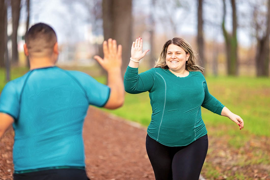 Plus size couple training and running outdoors. They are doing some cardio exercises for weight loss after quarantine period. While jogging they passing by each other