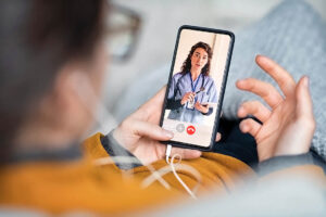 Close up of female doctor on video call with patient using smartphone. Rear view of young woman patient in conversation with specialist over video conferencing using smart phone. Sick woman patient lying on sofa doing video consultation with doctor using phone and explain her symptoms.