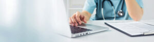 Asian Doctor or nurse in blue uniform concentrate working on laptop computer and preparing information of patients for meeting with medical team in hospital. Selective focus on hand. Banner, web