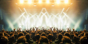 Concert wide arena with happy fans clapping.