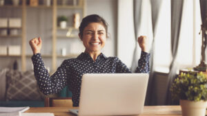 Euphoric young indian girl student winner celebrate victory triumph sit at home desk with laptop computer win online fortune feel excited get new job opportunity good exam result great news concept