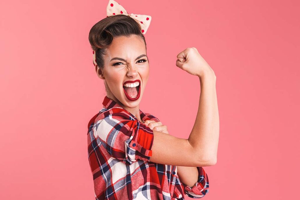 Photo of gorgeous strong young pin-up woman isolated over pink background wall showing biceps screaming.