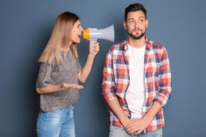 Young woman with megaphone shouting at man on color background